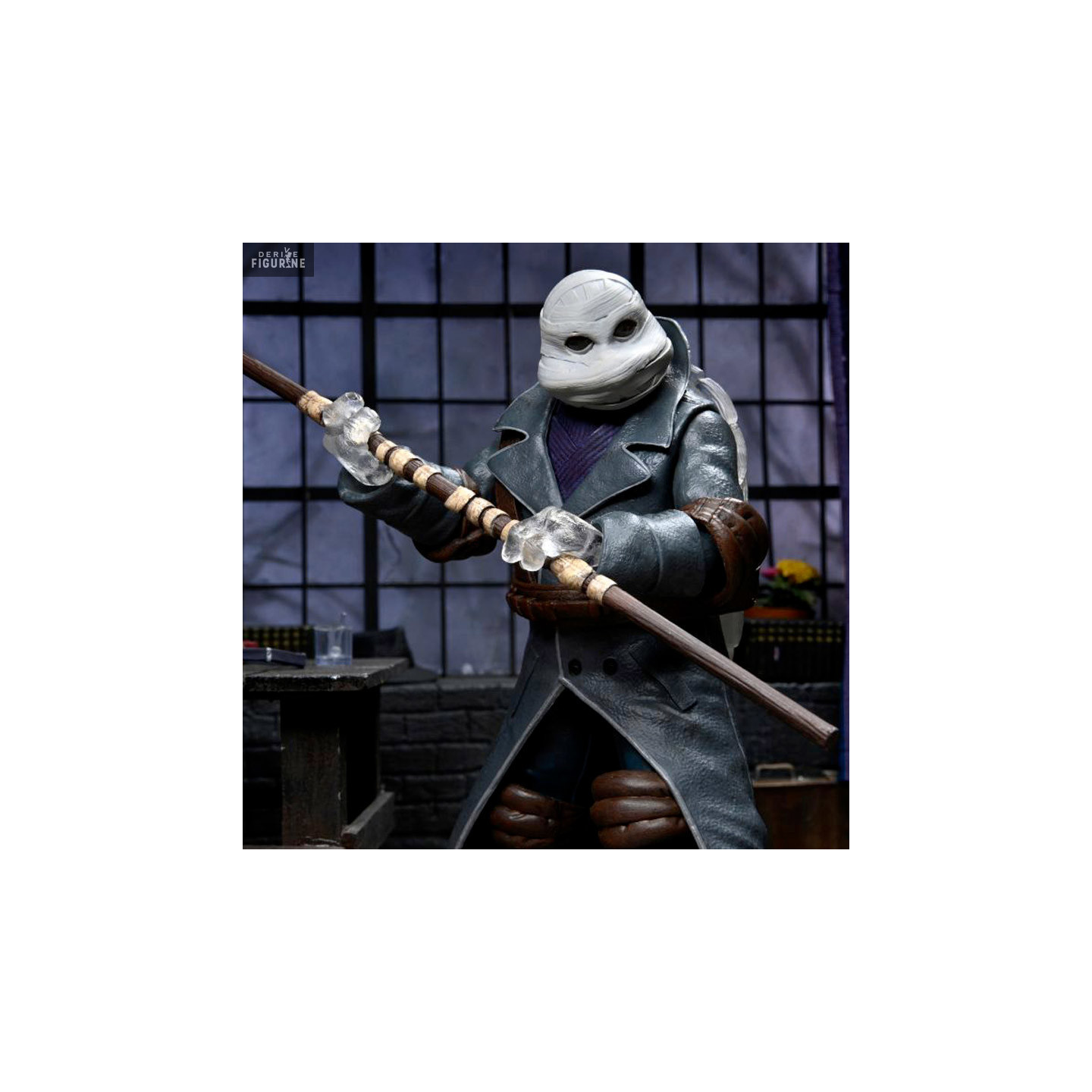 Afin de pouvoir compléter votre collection de Tortues Ninja déguisées en monstres, vous allez pouvoir prendre cette figurine de Donatello qui est transformé en homme invisible. Avec ses parties interchangeables, vous pourrez faire en sorte que ses mains et ses pieds soit transparent, et il en est de même pour sa carapace, qui laisse apparaître des parts de pizza.