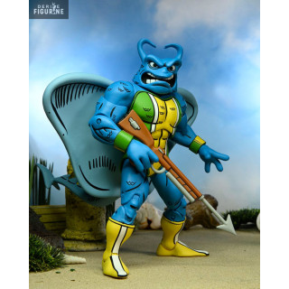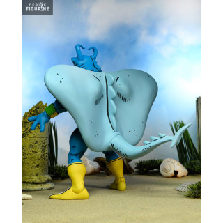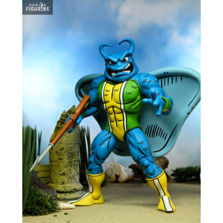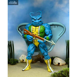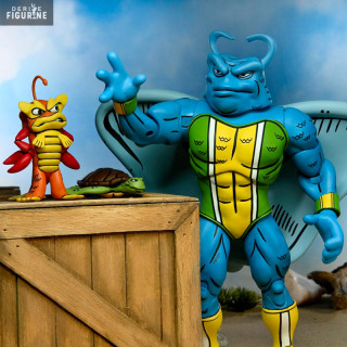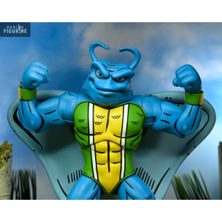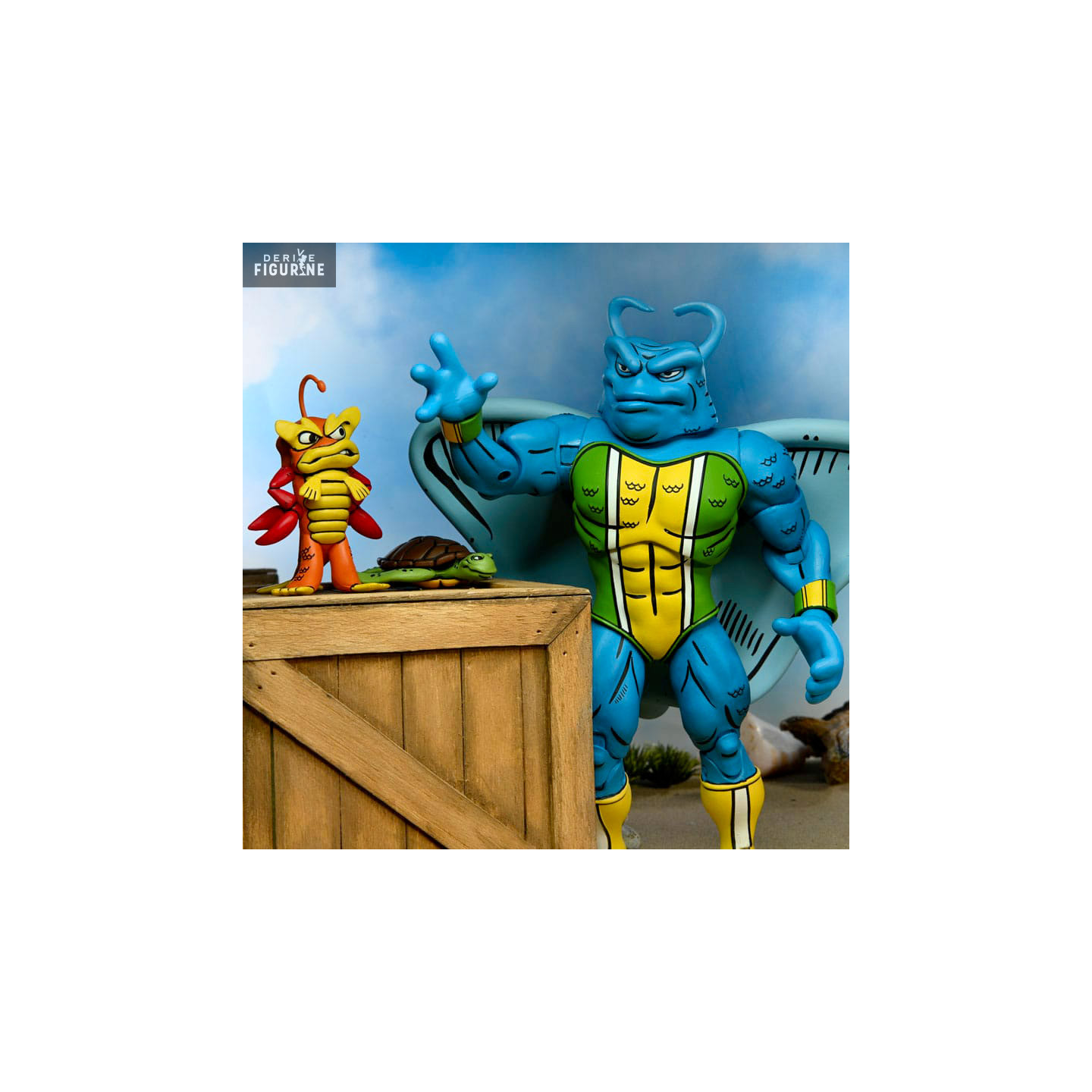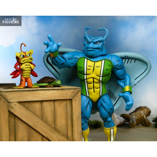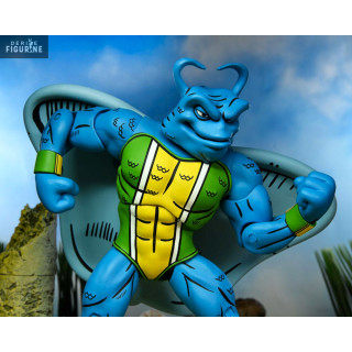 Sur cette figurine officielle NECA, Man Ray se dresse dans une posture puissante : torse bombé, antennes dressées, visage aux sourcils froncés. Son costume mêle le bleu profond de sa peau à un plastron vert et jaune, tandis que de larges ailes articulées s’ouvrent dans son dos. Ses bottes montantes et ses bracelets sculptés soulignent son allure métallique et robuste.