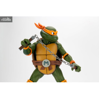 Figurine officielle de Michelangelo mesurant environ 38 centimètres de haut, à l'échelle 1/4. Elle est issue de la collection Giant-Size. Le fabricant est NECA.
