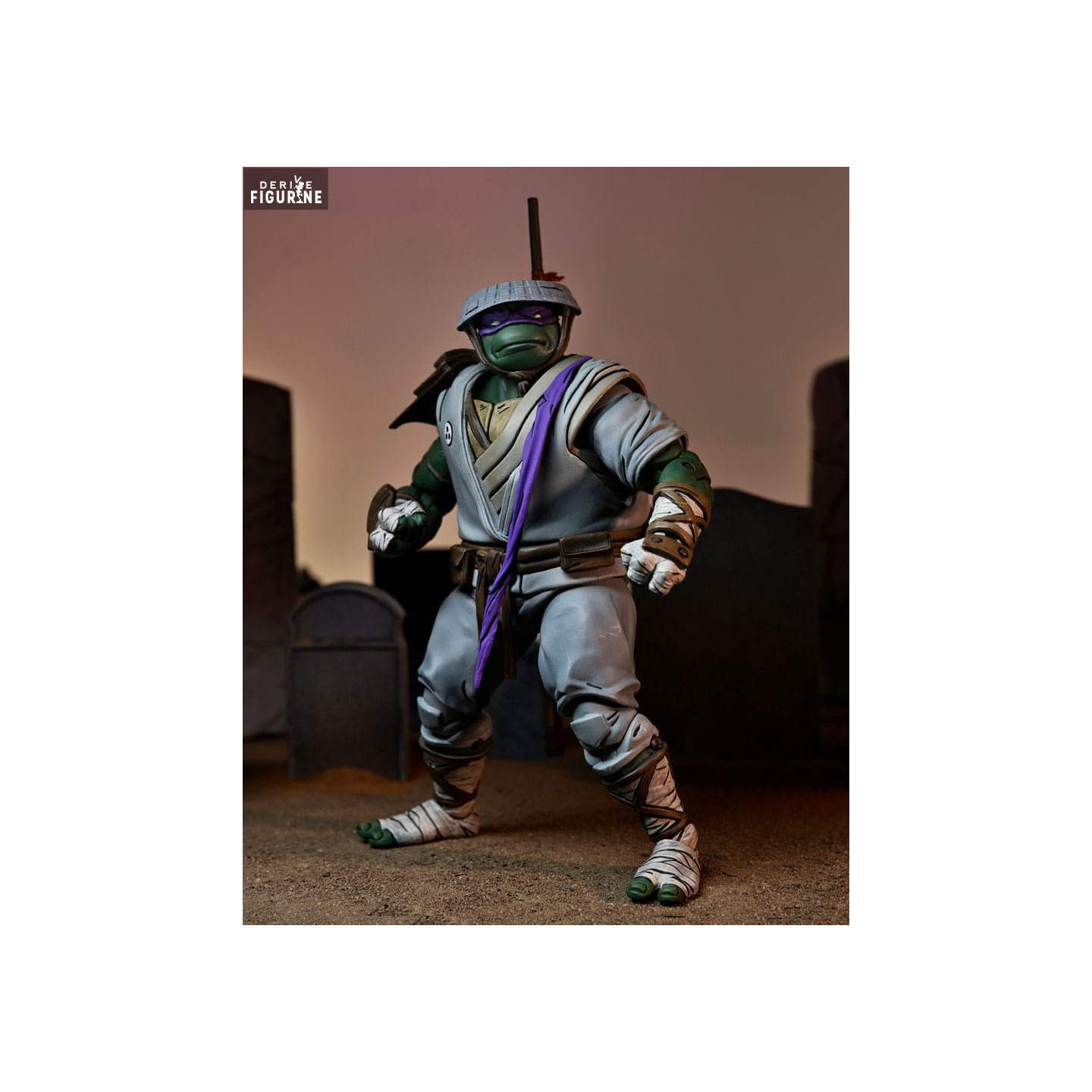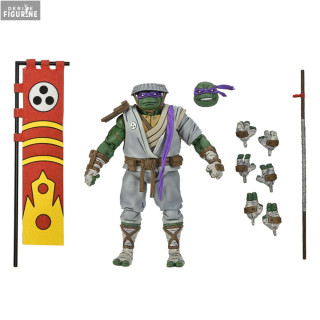 Cette figurine de Donatello est représentée dans une tenue de ninja de style samouraï, mélangeant des éléments traditionnels avec des détails modernes. Il porte un uniforme gris et violet, avec des bandages sur les bras et les jambes, et un bâton Bo, son arme de prédilection. La figurine est également équipée d'un casque protecteur et de plusieurs autres accessoires.