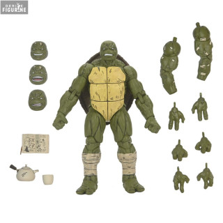 Équipement et Accessoires : La figurine est livrée avec divers équipements, dont un journal de Splinter, une théière avec une tasse, et des bras endommagés interchangeables, ajoutant une couche de réalisme et permettant de recréer les scènes emblématiques de The Last Ronin.