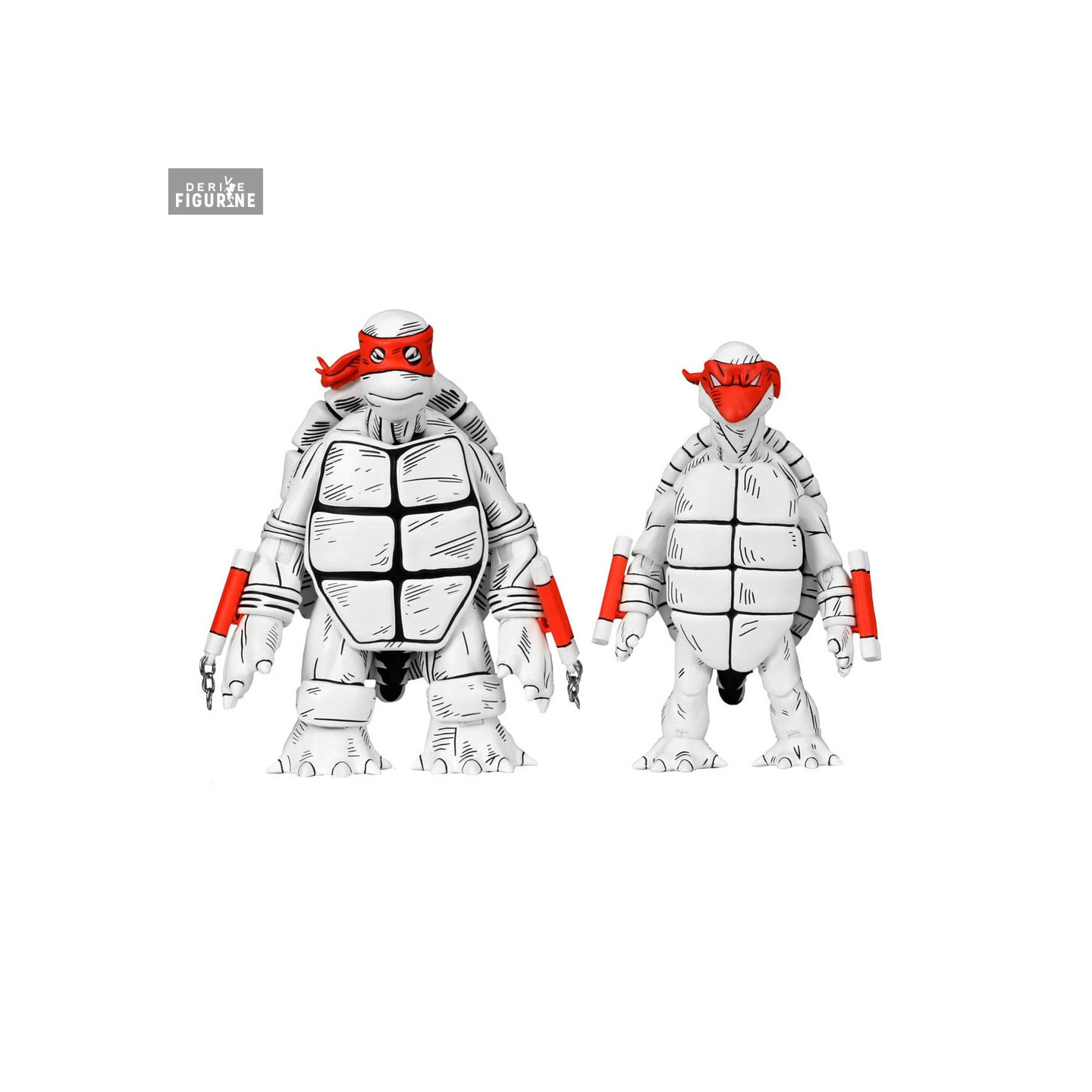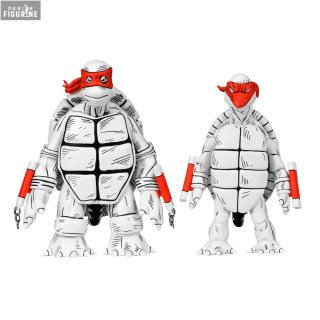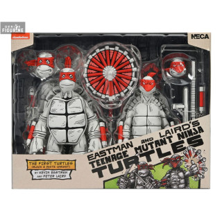 Figurines officielles de Black and White First Turtles mesurant environ 18 centimètres de haut. Le fabricant est NECA.