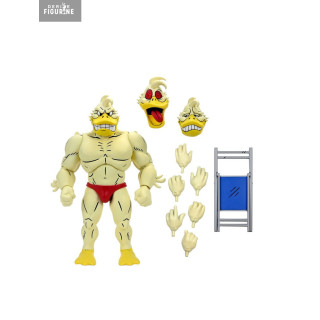 La figurine affiche une musculature grotesque, un slip rouge minimaliste, des pattes palmées jaunes et un sourire carnassier déformé. Elle inclut trois têtes interchangeables aux expressions délirantes : rictus fixe, hurlement furieux et grimace tendue. Tout est sculpté avec précision, sans lisser l’aspect rugueux et exagéré du personnage tel qu’il apparaît dans les comics originaux.