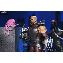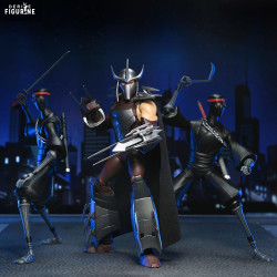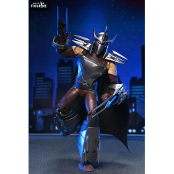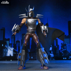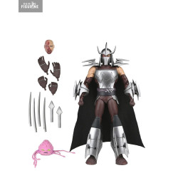 La figurine reprend fidèlement son apparence de 2012 : armure argentée aux plaques anguleuses, gantelets armés de longues lames, jambières massives et casque à cornes effilé. Sa cape noire complète son côté imposant. On trouve plusieurs accessoires, dont des lames interchangeables, un set de mains supplémentaires, une tête alternative non masquée et un Krang rose directement inspiré de la série.