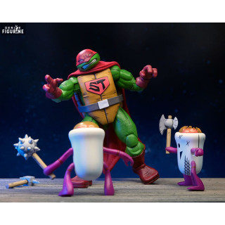 Cette figurine en PVC de 18 cm, fabriquée par NECA, est conçue avec un souci du détail fidèle aux Mirage Comics. Elle est livrée avec plusieurs accessoires interchangeables, notamment des armes médiévales, des mains alternatives, et même deux petits compagnons aliens qui ajoutent une touche unique à cet ensemble. Avec ses finitions soignées et son style inspiré des comics classiques, cette figurine est un véritable trésor pour les collectionneurs et les fans des versions alternatives des Tortues Ninja.