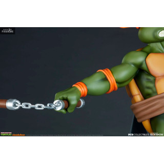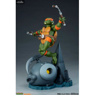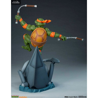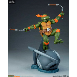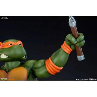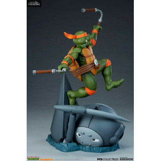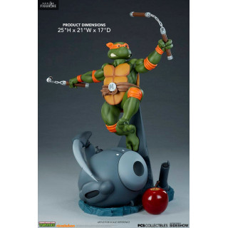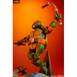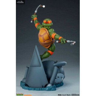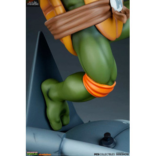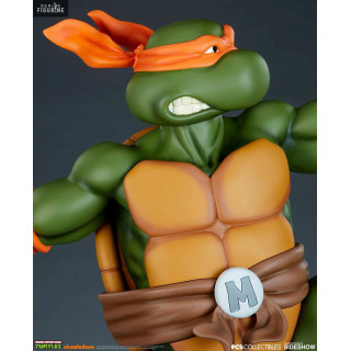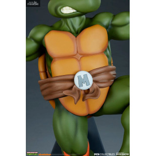 Figurine officielle de Michelangelo en résine mesurant environ 63x53x43 centimètres à l'échelle 1/4. Le fabricant est Pop Culture Shock Collectibles Inc.