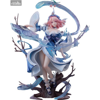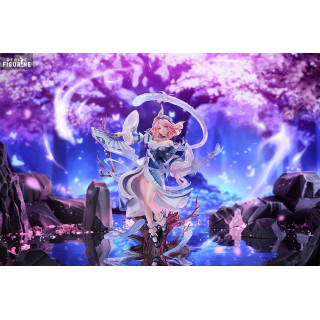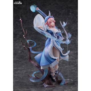 Le design met en valeur des volutes translucides et des papillons de brume qui s’élancent autour d’elle, tandis qu’un éventail orné de motifs floraux s’ouvre dans sa main gauche. Les nuances rosées de ses cheveux et le détail minutieux de ses ornements – rubans, collerette et symbole gravé sur le chapeau – soulignent la finesse artistique de la pièce.