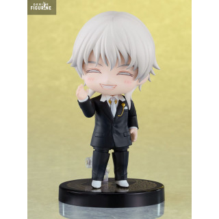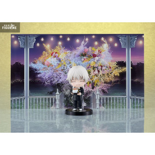 Cette Nendoroid restitue son costume cérémoniel avec un soin remarquable : un costume trois-pièces noir parfaitement taillé, rehaussé de détails dorés comme la chaîne de montre et les boutons finement gravés. Sa chevelure argentée tombe en mèches soyeuses sur ses épaules, encadrant un visage aux yeux ambrés et aux sourcils légèrement arqués. Les deux expressions — regard posé ou clin d’œil malicieux — permettent de faire vibrer toute la palette de son caractère.