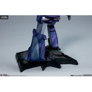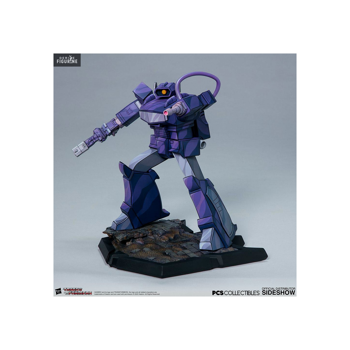 Figurine officielle de Shockwave en résine mesurant environ 23 x 23 x 24 centimètres. Le fabricant est Pop Culture Shock.