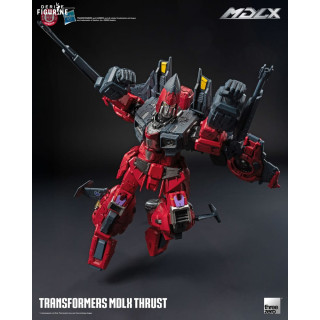 Dans l’univers des Transformers, Thrust est l’un des Seekers les plus reconnaissables par son design agressif et sa couleur rouge distinctive. Fidèle aux Decepticons, il fait partie de l’élite aérienne sous les ordres de Megatron, prêt à semer le chaos dans les airs comme au sol. Cette version issue de la collection MDLX modernise son apparence tout en conservant l’essence du personnage original.