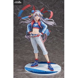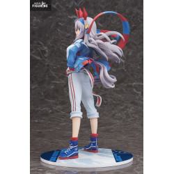 La figurine la présente dans une pose assurée, sourire éclatant aux lèvres, les poings sur les hanches. Sa tenue streetwear aux teintes bleu, rouge et blanc reflète son style sportif et dynamique. Sa queue de cheval argentée fouette l’air, accompagnée de longs rubans flottants qui amplifient la sensation de mouvement.