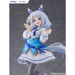 Visuellement, elle est sculptée dans une pose très dynamique, sur une jambe, l’autre relevée derrière, les deux mains tendues dans un geste accueillant. Elle a des cheveux gris clair coupés au carré, des oreilles de cheval avec des détails bleu et blanc, et une longue queue assortie. Sa tenue est dominée par le bleu et le blanc : une robe courte à jupe évasée, un haut avec des bordures bleues et de petits accents dorés, et un grand nœud bleu à la taille. Elle porte des collants gris foncé et des chaussures bleu/noir, avec des manchons blancs duveteux aux chevilles. Le tout repose sur un socle avec un dessus herbeux, posé sur une base bleue avec une petite plaque nominative à l’avant.