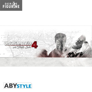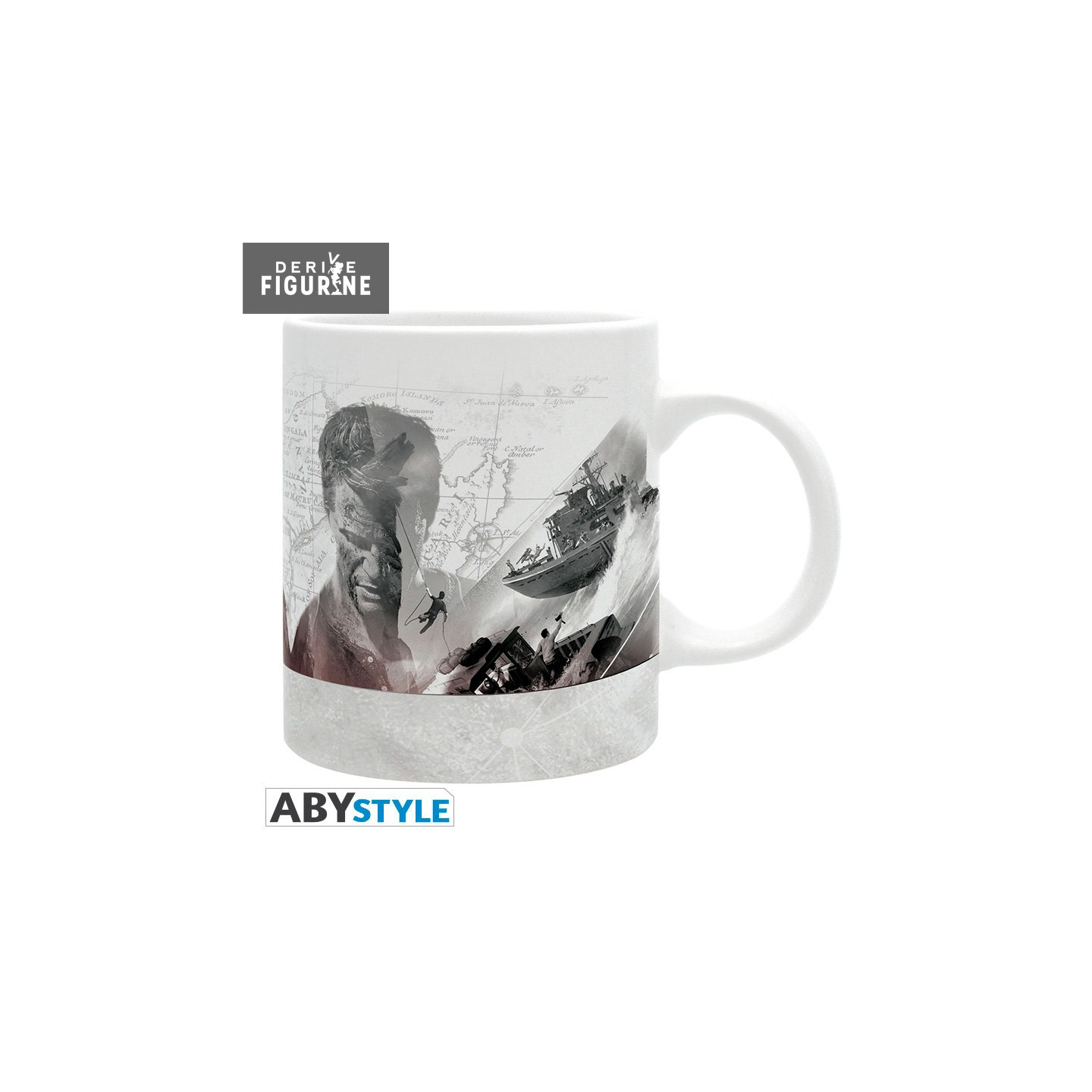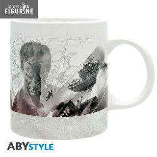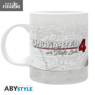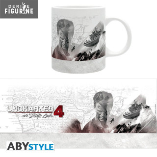 Sur l'image de ce mug, vous pouvez avoir un panel d'Uncharted 4: A Thief End. Vous avez une carte, la silhouette de Nathan Drake et deux navires qui se font face.