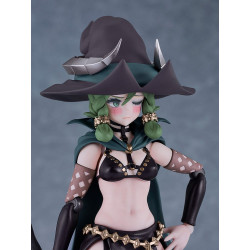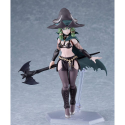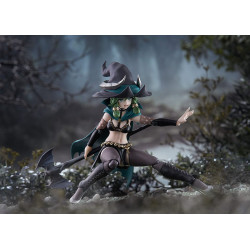 La figurine suit précisément son design : large chapeau de sorcière aux bords irréguliers, cheveux verts ondulés, tenue noire révélant bras et ventre, et cape sombre déchirée en pointes. Elle porte des bottes montantes lacées, des gants assortis et une ceinture ornée d’anneaux dorés. Son arme, une longue hache noire au bout effilée, est tenue avec calme par sa main droite. L’ensemble transmet élégance, danger et mysticisme.