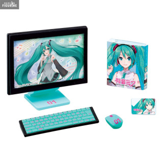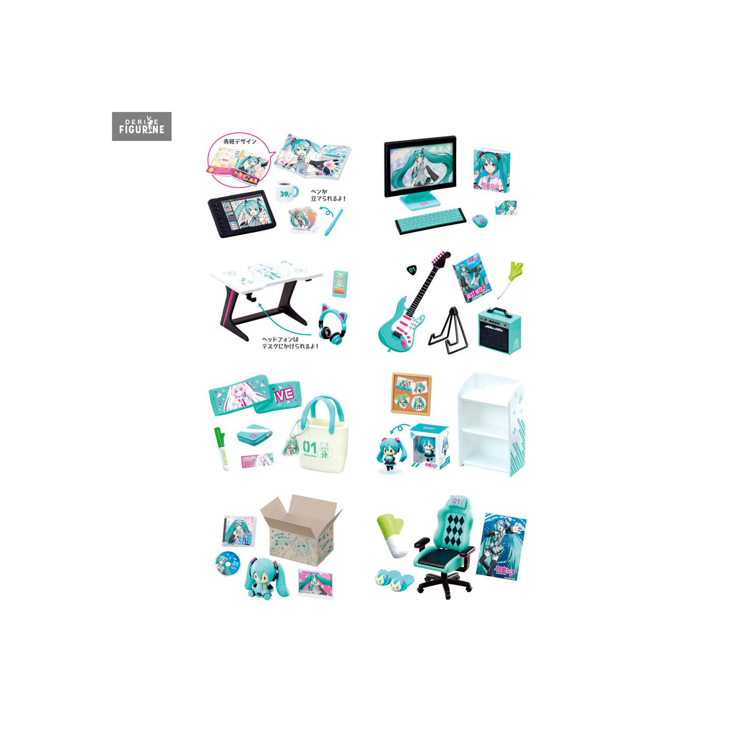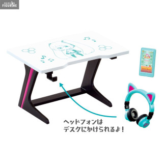 Ce set Vocaloid sur l'univers d'Hatsune Miku permet d'obtenir un semble de figurines baptisé Accessoires Room et qui permettent de donner vie au bureau et à la chambre d'une petite figurine de Miku Hatsune. Le pack contient les éléments suivants : PC, bureau, tablette, chaise, Guitare, CD, Étagère et Sac. Pour faire simple, tous les nombreux éléments visibles sur les photos sont inclus !