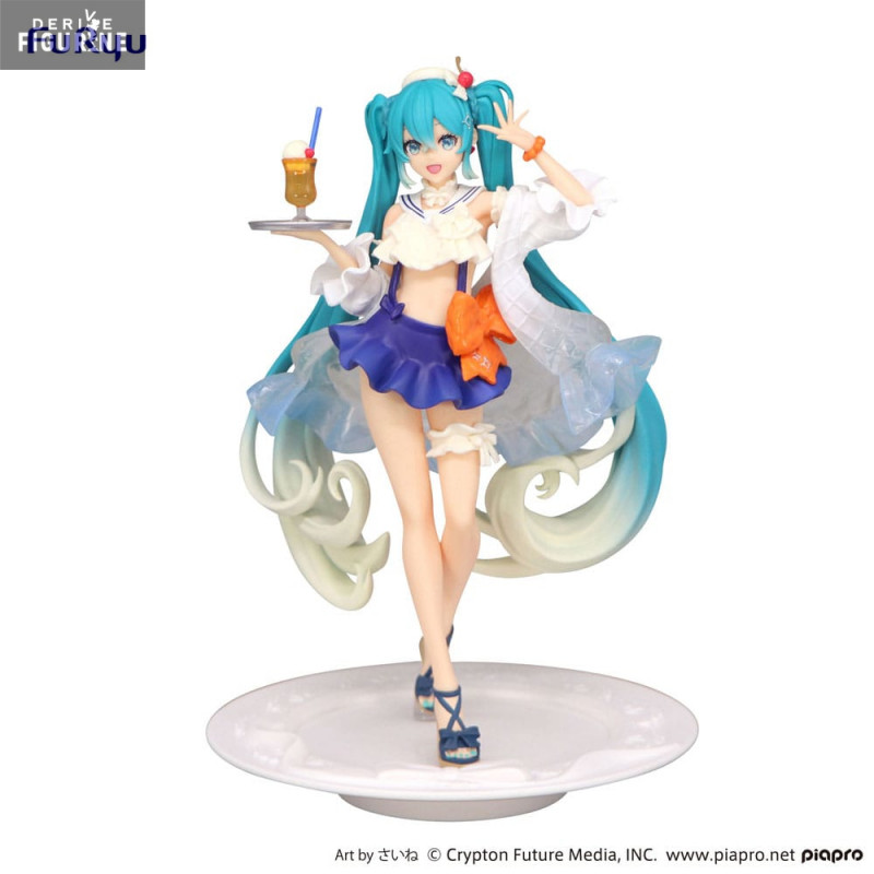 Hatsune Miku rayonne de sa beauté habituelle avec une touche de douceur et de fraîcheur, ses cheveux turquoise flottant légèrement dans l'air tandis qu'elle se prépare à offrir une expérience tropicale à ses clients. Les détails minutieux de la sculpture capturent l'énergie dynamique et enjouée de Miku, ajoutant une touche de gaieté à n'importe quel espace.