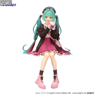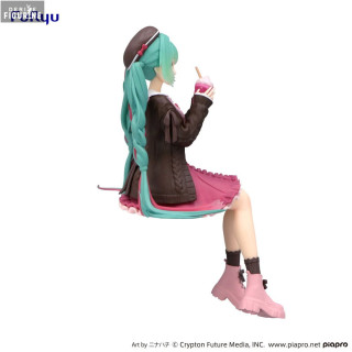 Figurine officielle de Hatsune Miku, Autumn Date Pink Color en PVC mesurant environ 14 centimètres de haut. Elle est issue de la collection Noodle Stopper. Le fabricant est FuRyu.