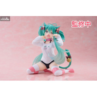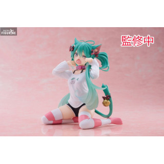 Cette version "Cute" de Hatsune Miku montre le personnage dans une tenue décontractée et charmante. Elle porte un haut blanc avec des motifs colorés et des bas assortis rose et blanc, ajoutant une touche de douceur à son apparence. Les détails minutieux de ses cheveux, ornés de rubans et de clochettes, ainsi que ses oreilles de chat ajoutent une dimension ludique à cette figurine.