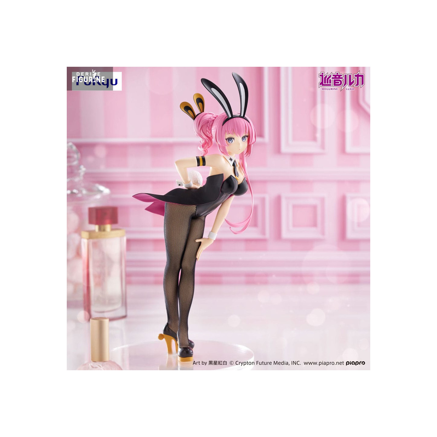 Sur la figurine, tu notes immédiatement son costume de bunny girl revisité : serre-taille noir cintré, jupe courte aux revers fuchsia, collants résille texturés et escarpins dorés élégants. Sa chevelure rose pastel, coiffée en chignons flous, se marie aux longues oreilles de lapin noires aux intérieurs dorés. Chaque détail, du nœud papillon blanc à ses bracelets assortis, reflète fidèlement l’image vue sur la photo.