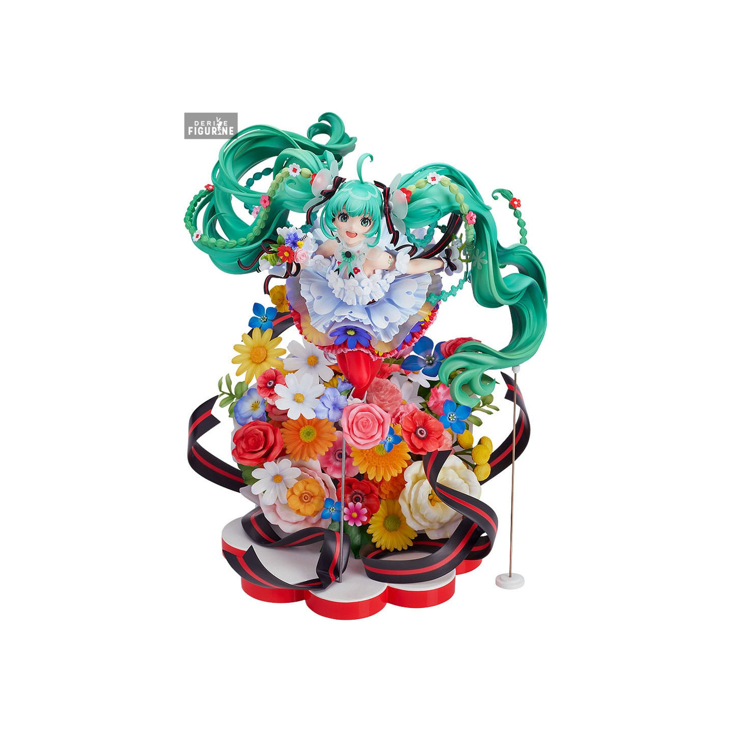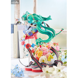Miku est ici représentée dans une tenue évoquant un bouquet vivant. Son visage rayonne d’enthousiasme, les bras ouverts en un geste de bienvenue, tandis que sa robe multicolore en volants superposés jaillit d’un immense socle de fleurs. Autour d’elle, des centaines de pétales, de marguerites, de roses et de pivoines s’entrelacent dans un véritable feu d’artifice floral. Ses longues couettes turquoise s’animent en spirales, décorées de perles et de fleurs miniatures, capturant un instant suspendu au milieu de la scène.