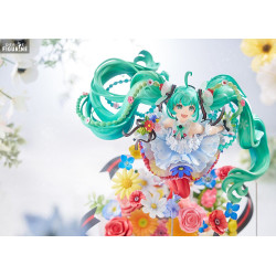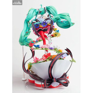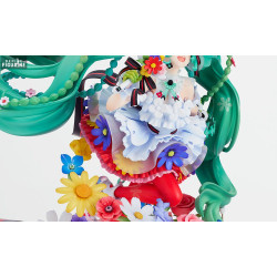 L’apparence fidèle à l’image montre une composition extrêmement riche : textures variées des fleurs, dégradés subtils sur la robe, détails minutieux dans les accessoires capillaires. La sculpture fait preuve d’un dynamisme exceptionnel, notamment dans la posture aérienne de Miku et la fluidité de ses cheveux en mouvement. Le socle lui-même, conçu comme un podium fleuri, amplifie cette impression de spectacle et de légèreté.