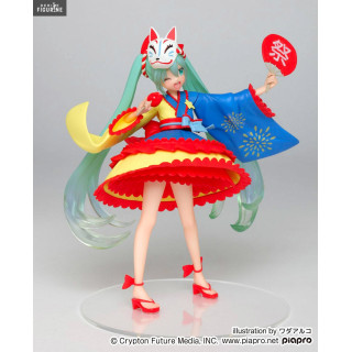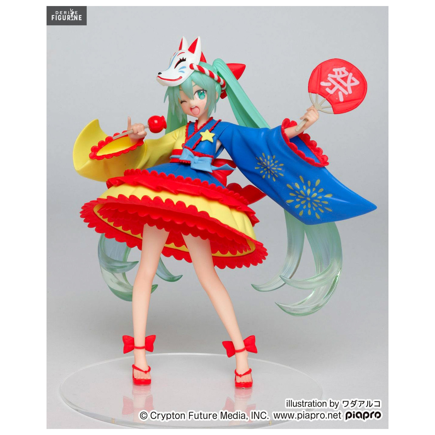 Miku Hatsune est de retour dans une toute nouvelle tenue qui est très colorée. Elle tient un éventail et une pomme d'amour, sur sa tête se trouve un masque et enfin, on peut voir des feux d'artifices sur ses manches. Cela ne vous donne pas envie d'aller faire un tour à la fête foraine ?