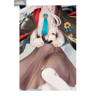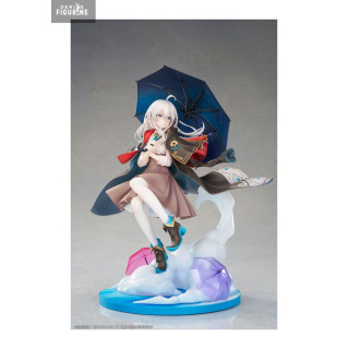 Le design regorge de détails : manteau sombre flottant au vent, parapluie bleu foncé légèrement ouvert, bottines rehaussées de bleu et jupe marron virevoltante. Sa longue chevelure argentée est sculptée avec précision, chaque mèche suivant le mouvement de l’air. Le socle met en scène des nuages stylisés avec deux parapluies colorés (rose et violet) au sol, ajoutant une touche de narration visuelle très réussie.