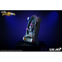 La figurine montre Tyrande dans une posture frontale, solennelle, placée au centre d’une carte de jeu surdimensionnée. Son regard perçant, ses bras ouverts et son armure finement sculptée évoquent à la fois la majesté divine et la menace silencieuse. Son cadre en polystone, orné d’un dragon sculpté, entoure la scène avec force et élégance. Chaque détail – de ses cheveux flottants à la texture de sa tenue – est fidèlement reproduit.