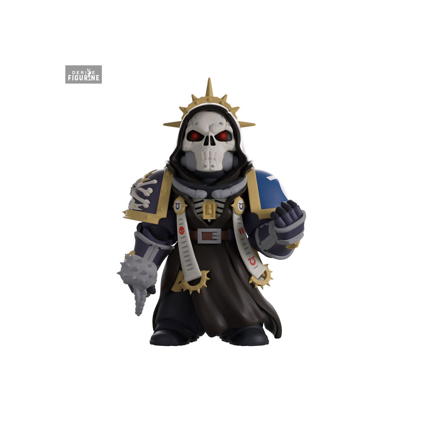 Cette figurine stylisée capture toute la prestance et l’aura intimidante d’un Chapelain. Son casque en forme de crâne, aux orbites rouges brillantes, surmonte une armure richement décorée, mêlant plaques bleues et dorures. Une auréole crénelée se dresse derrière sa tête, symbole de son rôle sacré et de son autorité. Il arbore une bure noire recouvrant partiellement son armure, ornée de parchemins litaniques fixés à sa poitrine et à sa taille.