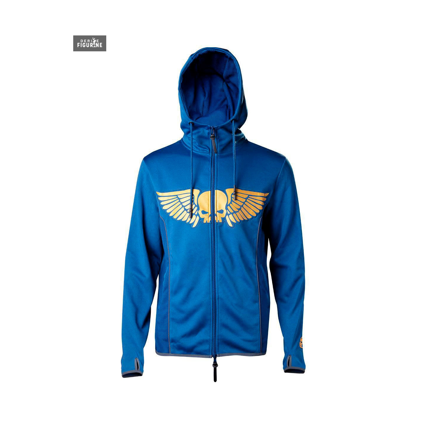 Depuis de nombreuses années, Warhammer 40 000 a su tirer profit de son succès, en commençant son aventure avec un jeu de plateau. Vous pouvez customiser vos figurines comme bon vous semble, mais ici, nous sommes devant un sweat bleu des Spaces Marines avec le fameux crâne ailé sur le devant.