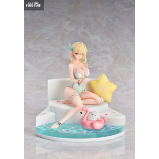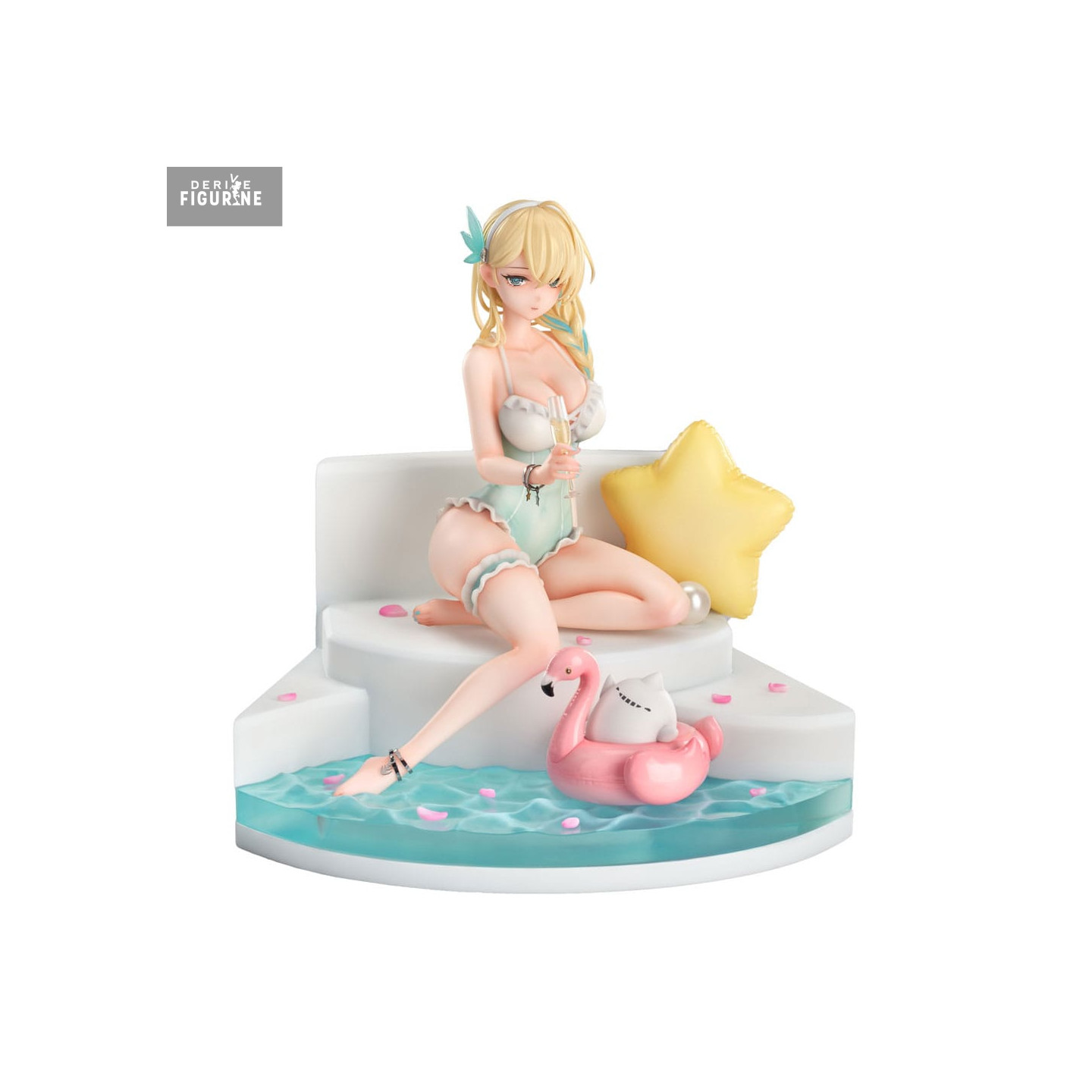 Le design met l’accent sur de nombreux détails charmants : un coussin étoile jaune placé à ses côtés, une bouée flamant rose flottant dans l’eau avec un petit chat blanc à l’intérieur, ainsi que des pétales délicatement posés à la surface. Sa chevelure blonde, décorée d’un ruban turquoise, complète l’atmosphère légère et ensoleillée de la scène.
