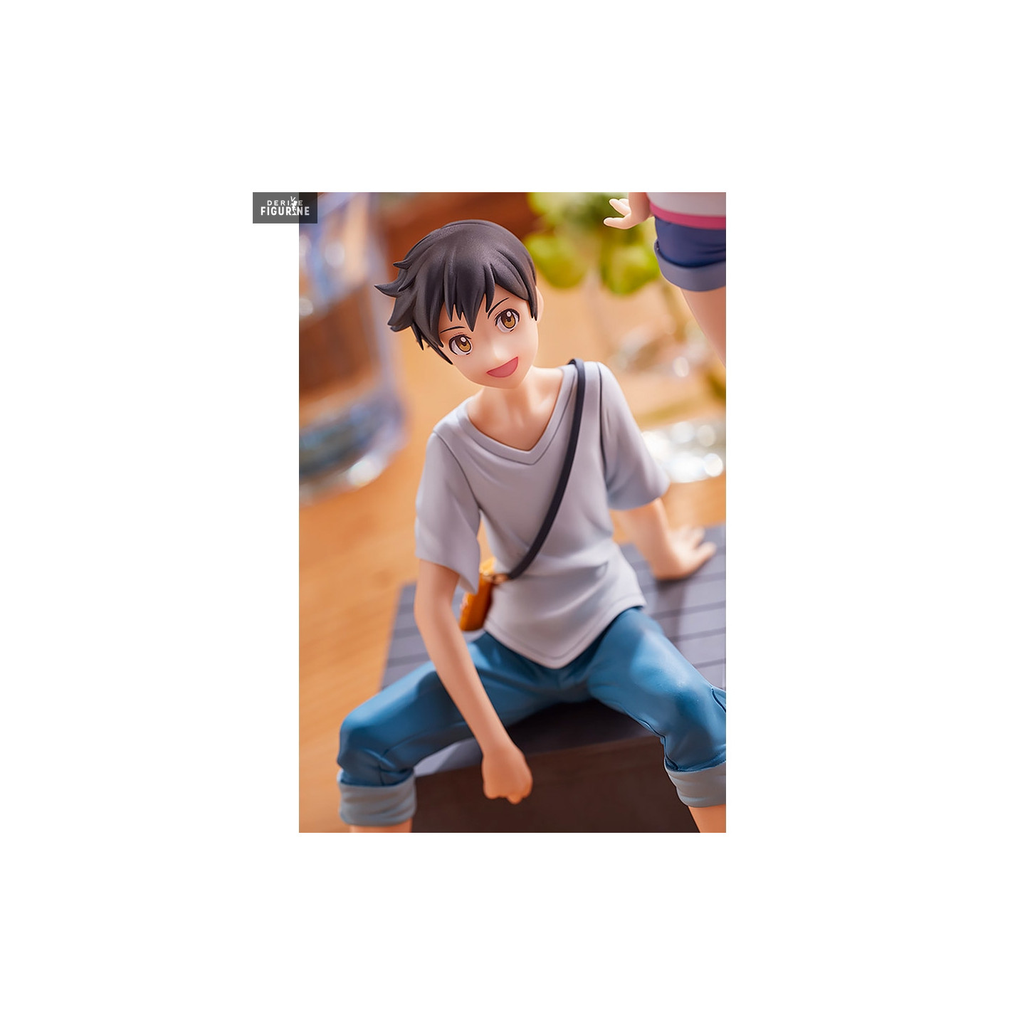 Cette figurine, tirée de la collection Pop Up Parade, capture à la perfection l’allure décontractée et le sourire chaleureux de Hodaka. Assis sur une boîte, vêtu de son t-shirt simple et de son pantalon roulé, il reflète une scène du film qui symbolise sa curiosité et son optimisme face aux défis. La précision des détails, comme son sac en bandoulière et ses baskets fidèlement reproduites, montre l’attention portée à la fidélité au personnage.