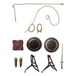 Visuellement, on retrouve sa tenue de combat iconique avec le plastron rouge orné du symbole de l’aigle, la jupe courte bleu foncé et la ceinture dorée, complétés par les bottes montantes, les brassards de protection et le diadème sur son front. Les cheveux longs et sombres encadrent son visage sérieux, et les nombreux points d’articulation visibles sur les bras, les jambes et le torse permettent de lui faire adopter des poses dynamiques. Le set d’accessoires comprend notamment un lasso, une épée, des boucliers et plusieurs mains interchangeables afin de varier les scènes de combat ou de garde, tout en restant stable sur ton présentoir grâce à sa conception de figurine articulée.