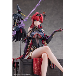 Visuellement, la figurine la représente assise sur une grande caisse noire au relief “bois” et aux panneaux latéraux ronds façon compartiments, avec un tissu rouge à motifs dorés qui retombe sur l’arête. Yinlin porte une tenue noire très structurée, aux liserés rouges et détails dorés, avec des sangles et ornements qui soulignent la silhouette sans l’alourdir. Ses longs cheveux rouges, coiffés avec un accessoire délicat, encadrent un visage aux yeux clairs et à l’expression posée. Les jambes croisées, elle est chaussée d’escarpins noirs, tandis que son bras gainé de violet et de noir prolonge l’élégance jusqu’au bout des doigts. Derrière elle, un petit compagnon stylisé, sombre et “poupée”, brandit une longue lame d’énergie translucide violette, créant une diagonale spectaculaire autour du duo. Une seule phrase pour l’expo: cette composition fonctionne particulièrement bien sur une étagère à hauteur des yeux, pour profiter des lignes et des effets translucides.