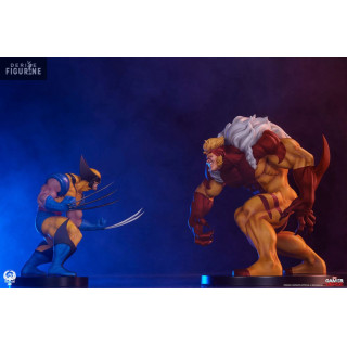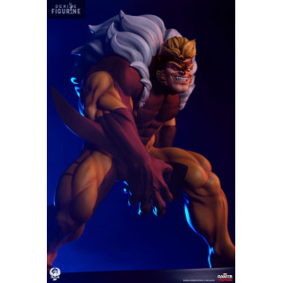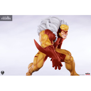 Figurine officielle de Dents-de-sabre (Sabretooth) en PVC mesurant environ 20 x 18 x 19 centimètres, à l'échelle 1/10. Le fabricant est Premium Collectibles Studio.