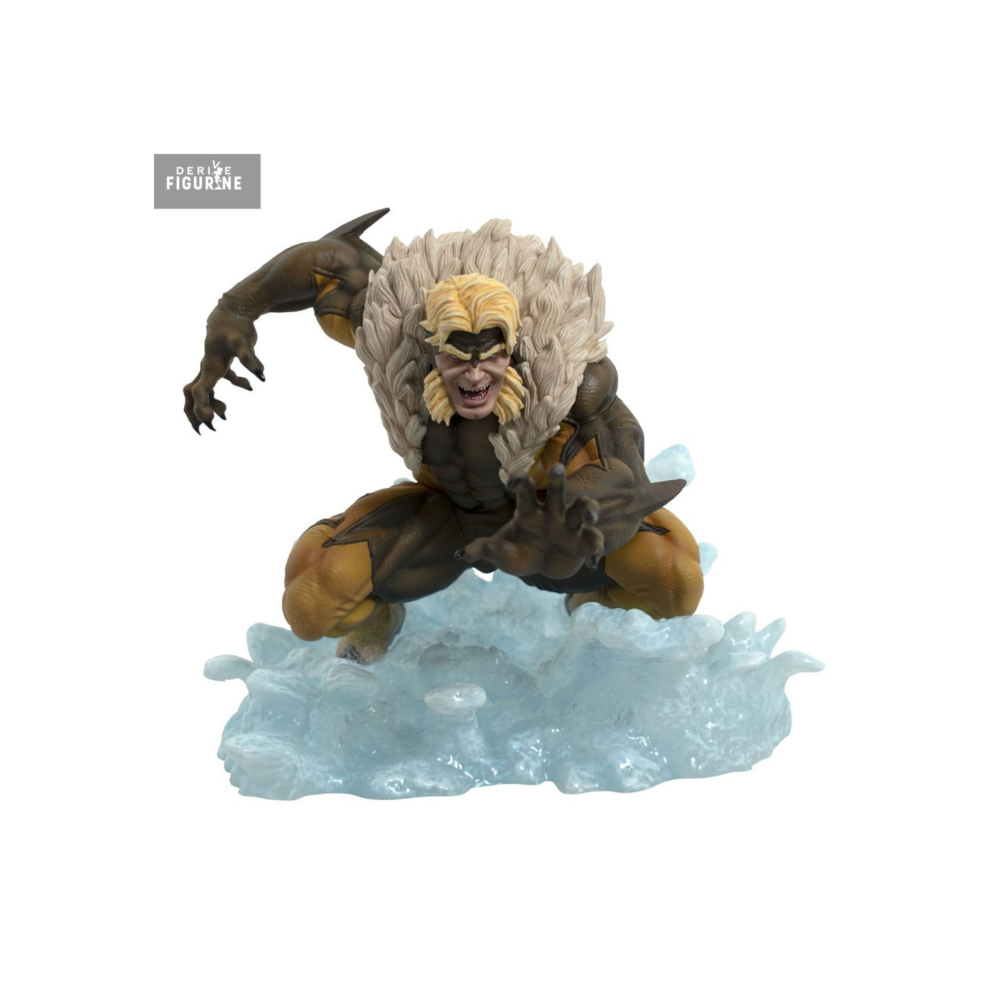 Diamond Select Toys signe ici une pièce de 16 cm en PVC, issue de la collection Gallery, qui capture Sabretooth en pleine action. Le sculpt est percutant : muscles bandés, griffes sorties, hurlement prêt à exploser. On le voit bondir, prêt à déchirer, les pieds plantés dans une base effet glace qui semble voler en éclats sous son élan.