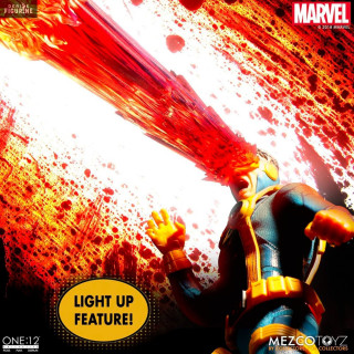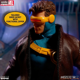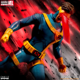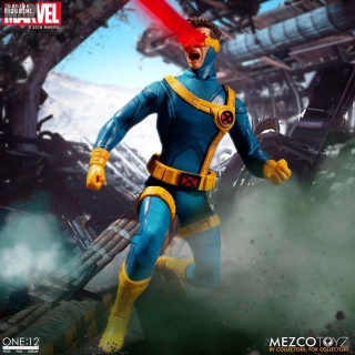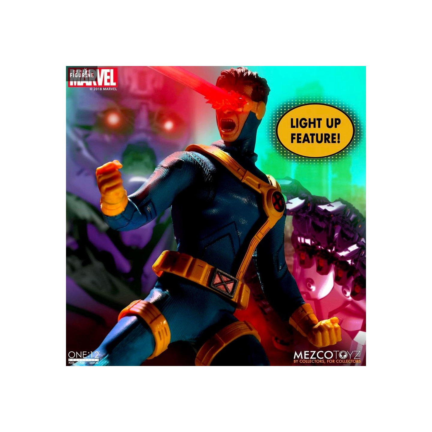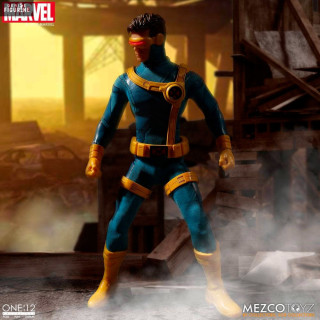 Figurine officielle de Cyclops mesurant environ 16 centimètres de haut, à l'échelle 1/12. Le fabricant est Mezco Toys.