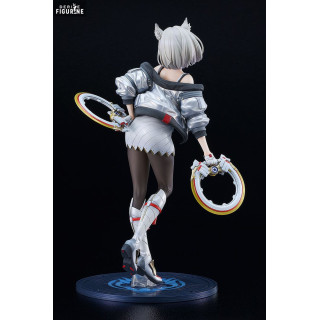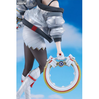 Mio, connue pour son charisme et sa force tranquille, est représentée ici dans une pose dynamique qui évoque sa détermination et sa grâce. Son design est fidèle à l'original, avec ses cheveux argentés et ses oreilles caractéristiques de demi-Homs, demi-Machina, qui lui confèrent un look unique et reconnaissable. Elle arbore son costume iconique de Xenoblade 3, mêlant des éléments futuristes à des touches classiques, comme sa veste blanche ajustée et sa jupe plissée, mettant en avant son style de combat agile et sa personnalité élégante.