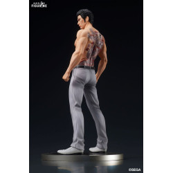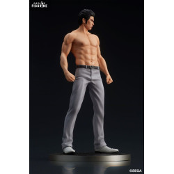 Kiryu est ici représenté dans une pose statique mais chargée de tension. Les poings serrés, les jambes bien ancrées au sol, il incarne l’assurance tranquille du Dragon de Dojima. Son pantalon gris ajusté, ses chaussures blanches et sa ceinture noire contrastent avec la nudité du haut du corps, mettant en valeur son impressionnante musculature.
