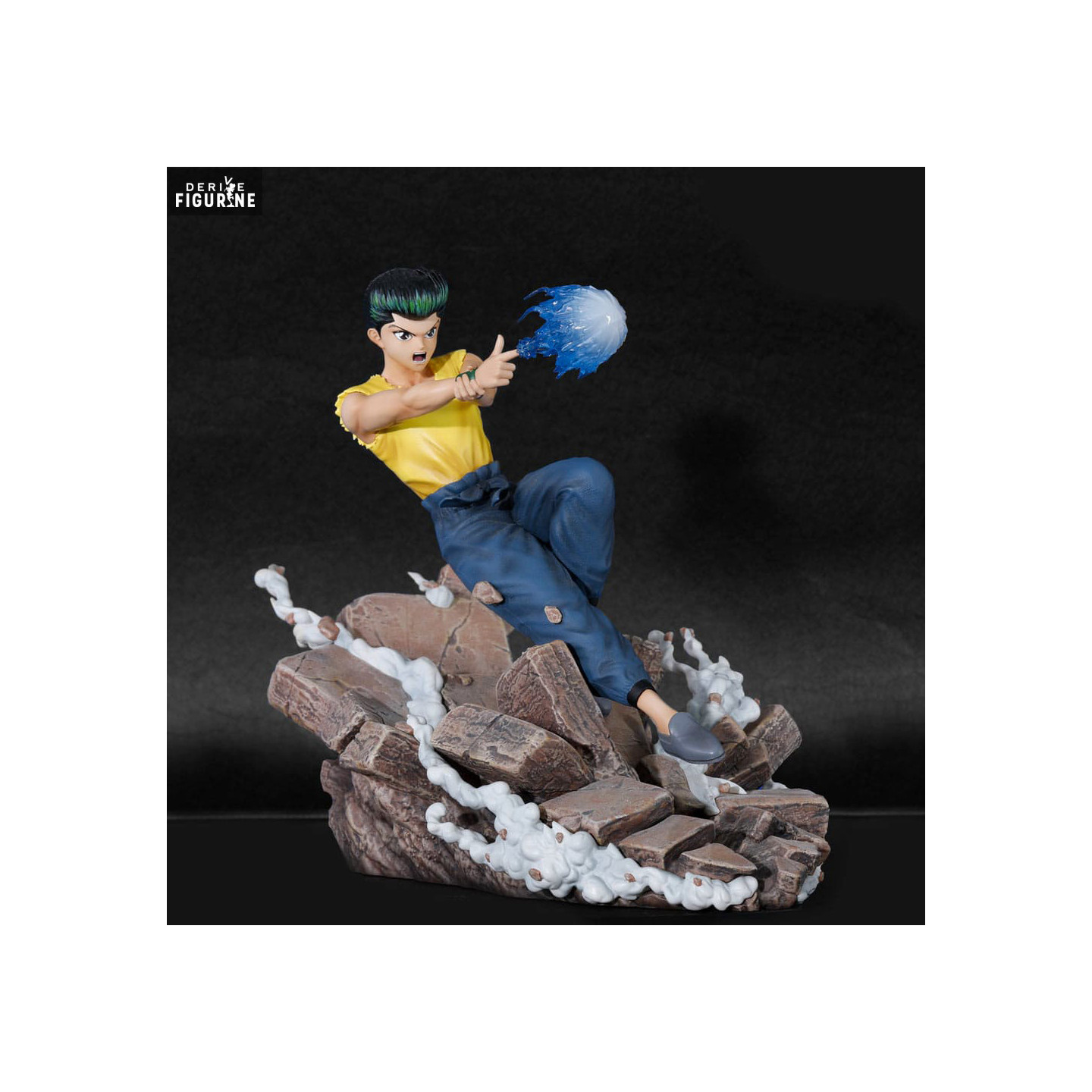 Le socle de la figurine est tout aussi impressionnant, représentant un terrain rocailleux en pleine destruction, témoignant de l'impact de l'attaque de Yusuke. Les effets de fumée et de débris ajoutent une dimension supplémentaire à cette scène, créant une atmosphère de combat intense qui ravira les fans de la série.