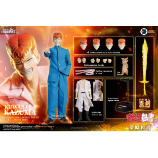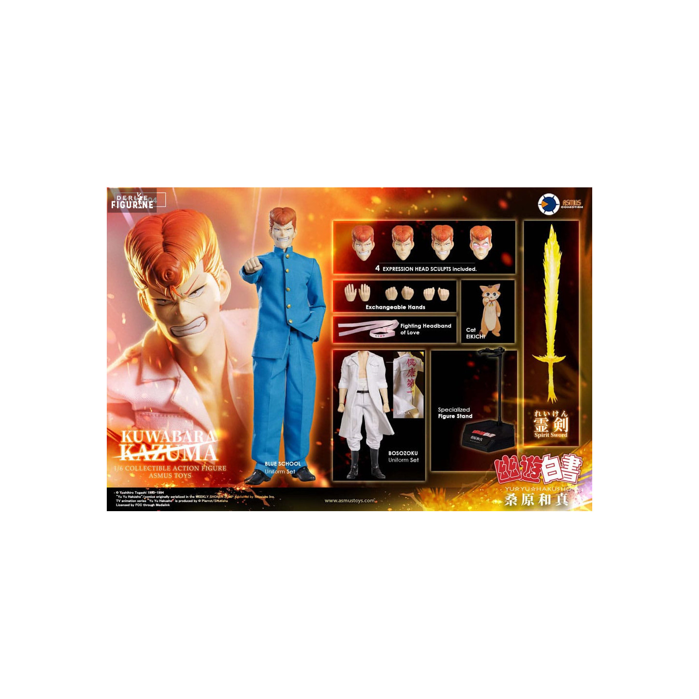 Cette figurine de Kuwabara, en version standard, capte parfaitement son apparence iconique et son attitude de bagarreur avec sa tenue d'uniforme bleu de lycée. Mesurant environ 30 centimètres et réalisée en PVC, cette reproduction à l’échelle 1/6 est proposée par Asmus Collectible Toys, un fabricant réputé pour ses figurines de collection détaillées. Ce modèle inclut des éléments spécifiques comme quatre visages interchangeables qui permettent d'afficher les différentes expressions caractéristiques de Kuwabara, de la colère à la détermination. De plus, la figurine inclut la fameuse « Épée Spirituelle », une arme qui définit l’identité du personnage dans ses combats. Le set est également fourni avec un socle de support et quelques accessoires, notamment le ruban de combat de l’amour et le chat Eikichi, un clin d’œil à l’attachement tendre de Kuwabara pour cet animal.
