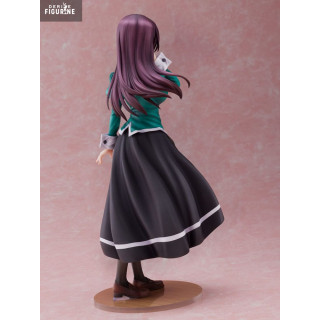 Mesurant environ 21 cm, cette statuette en PVC met en valeur son uniforme soigné : chemisier vert émeraude ajusté, foulard rouge noué au col, et longue jupe noire bordée de blanc. Ses cheveux aubergine, élégamment coiffés en ondulations lâches, encadrent un visage au regard à la fois doux et pénétrant. Les détails soignés – plis naturels de la jupe, coutures apparentes sur le col et sur les poignets – soulignent la qualité premium de la sculpture.