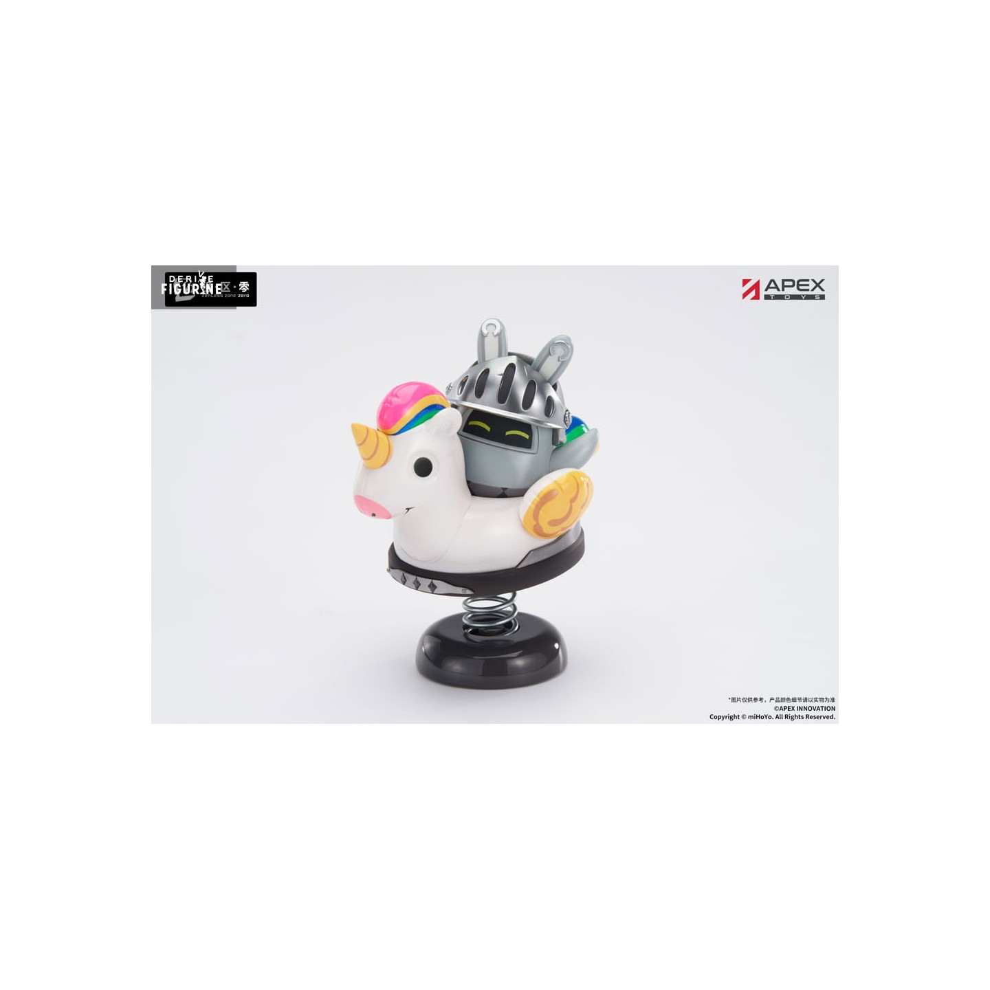 Cette figurine de la collection Happy Shake le présente dans une mise en scène ludique : installé dans une bouée licorne colorée, Knightboo arbore un grand sourire malicieux. Le ressort fixé à la base permet à la figurine de « trembler » ou osciller lorsqu’on la touche, renforçant l’effet comique et dynamique de l’ensemble.