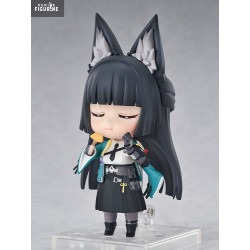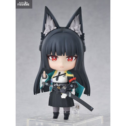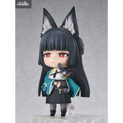 Le design respecte chaque détail du personnage : longues oreilles de renard noires aux pointes argentées, yeux rouges perçants, cheveux noirs lisses coupés droit. Elle porte une veste verte à motifs, une chemise blanche avec cravate noire, un plastron blindé et une jupe plissée sombre. Son katana est solidement attaché à sa ceinture, et plusieurs visages et accessoires interchangeables — comme le masque spirituel flottant — permettent de varier les poses.