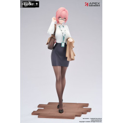 La figurine la montre dans une posture détendue, une main retenant une mèche de cheveux, l’autre portant son sac. Elle est habillée d’un chemisier blanc, d’une jupe crayon grise et de collants noirs. Un badge pend à son cou, tandis qu’un gilet beige repose sur son bras. Son sac à main brun et ses lunettes complètent un look sobrement raffiné. Sa coiffure rose courte et son expression sereine renforcent son charme.