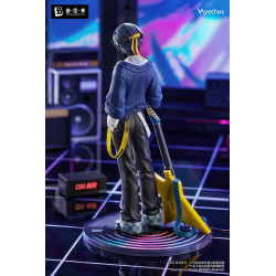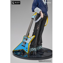 On le voit debout, légèrement penché, une main dans la poche et l’autre posée près d’une guitare électrique appuyée au sol. Il a les cheveux bleu nuit en mèches ébouriffées, avec une petite barrette jaune sur la frange, et des yeux clairs dont l’un ressort en jaune. Il porte un pull ample bleu marine à grosses côtes sur une chemise blanche, avec un collier/ras-du-cou noir. Le pantalon noir est déchiré sur une cuisse, avec une ceinture à anneaux métalliques et une sangle jaune qui pend sur le côté. Les chaussures sont noires, avec un revers gris bleuté à motif quadrillé. La guitare est bleue avec un contour jaune et un manche sombre, et l’ensemble repose sur une base ronde noire décorée de lignes rouges, facile à exposer en vitrine.
